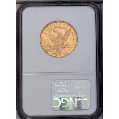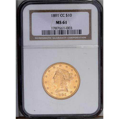 <B>1891-CC<$10> MS61 NGC.</B></I> This Carson City eagle's lustrous yellow-gold surfaces betray no wear, and the strike is solid for this issue. The usual marks that populate both sides restrict the grade.