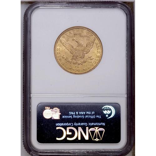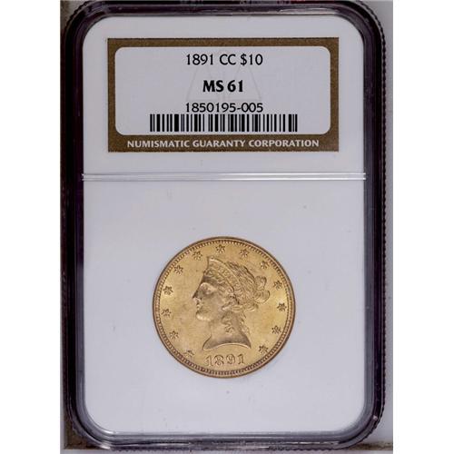 <B>1891-CC<$10> MS61 NGC.</B></I> This flashy canary-gold CC-mint eagle is boldly struck, but as expected for the grade, displays a number of individually minor marks. <BR><BR><B>Important notice:</B> Heritage usually auctions material at the rate of 200-250 lots per hour. On some occasions eBay Live bid software or the Internet may not be able to keep up with the pace of the auction. We recommend placing a realistic absentee bid now as insurance to avoid disappointment. Occasionally the auctioneer may eliminate or reject an eBay Live bid, and the auctioneer may also reopen a lot after the close of the eBay live bidding (usually because we missed an audience bid), and may reject your bid even if it shows you as the winning bidder. By bidding via eBay Live, you agree that Heritage may award the lot to another bidder at its sole discretion under the circumstances described above or any other reasonable circumstances. Since eBay bids are not shown to us until we open the lot on the floor, we treat those bids just like floor bids. In most cases the floor responds before the eBay bid is presented to us, due to Internet lag time, so for consistency we have made it a policy that floor bids are always considered first over tie eBay live bids. Also please note that all Heritage lots purchased through eBay Live carry a 20% Buyer's Premium. Please make sure you read the Terms and Conditions before you bid. This lot is being auctioned in conjunction with a live floor auction by Heritage Galleries & Auctioneers. All final auction and invoice information will be supplied by Heritage Galleries & Auctioneers, and all other information should be considered preliminary. Lot:4022 <BR><BR><B>Winning Notification and Billing:</B> After the FINAL session in this auction is complete, Heritage will send e-mail and snail mail invoices. This process normally takes several days. All final auction and invoice information will be supplied by Heritage Galleries & Auctioneers, and all other information should be considered preliminary. <BR><BR>This auction will be conducted on a live auction floor and over the Internet through eBay Live. If you choose to place an absentee bid, please take a moment to <font color='#0000ff'><u><a href='http://pages.ebay.com/liveauctions/help/before/laabsentee.html'>learn how eBay Live absentee bidding works</a></u></font><font color='#000000'>