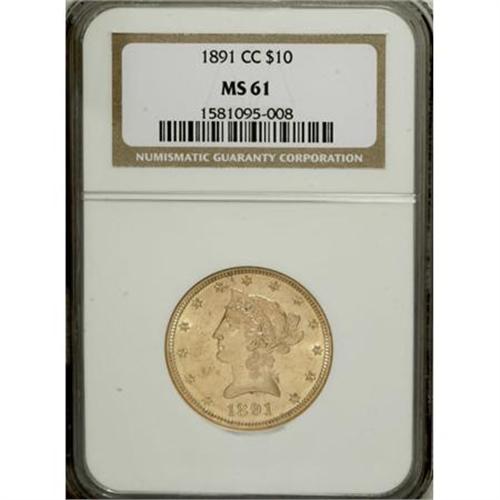 <B>1891-CC $10 MS61 NGC.</B></I> A fully lustrous and exactingly struck Carson City ten that has fewer noticeable marks than are usually present for the MS61 level. The normal mintmark variety.<BR><BR><B>Coin Engraver:</B> Christian Gobrecht<BR><BR><b>Shipping:</b> Coins & Currency (<a target="_blank" href="http://www.heritageauctions.com/common/shipping.php">view shipping information</a>)