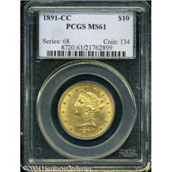1891-CC $10 MS61 PCGS. Breen-7035. The mintmark i <B>1891-CC $10 MS61 PCGS.</B></I> Breen-7035. The mintmark is clearly repunched on this interesting if somewhat overstated variety. A boldly struck and attractive representative with less contact marks than is usually associated with the grade. <BR><BR><B>Important notice:</B> Heritage usually auctions material at the rate of 200-250 lots per hour. On some occasions eBay Live bid software or the Internet may not be able to keep up with the pace of the auction. We recommend placing a realistic absentee bid now as insurance to avoid disappointment. Occasionally the auctioneer may eliminate or reject an eBay Live bid, and the auctioneer may also reopen a lot after the close of the eBay live bidding (usually because we missed an audience bid), and may reject your bid even if it shows you as the winning bidder. By bidding via eBay Live, you agree that Heritage may award the lot to another bidder at its sole discretion under the circumstances described above or any other reasonable circumstances. Since eBay bids are not shown to us until we open the lot on the floor, we treat those bids just like floor bids. In most cases the floor responds before the eBay bid is presented to us, due to Internet lag time, so for consistency we have made it a policy that floor bids are always considered first over tie eBay live bids. Also please note that all Heritage lots purchased through eBay Live carry a 20% Buyer's Premium. Please make sure you read the Terms and Conditions before you bid. This lot is being auctioned in conjunction with a live floor auction by Heritage Galleries & Auctioneers. All final auction and invoice information will be supplied by Heritage Galleries & Auctioneers, and all other information should be considered preliminary. Lot:6763