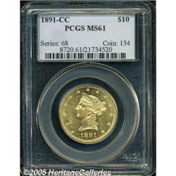 <B>1891-CC $10 MS61 PCGS.</B></I> Breen-7035. The mintmark is sharply repunched east. A few marks are noted but do not deny the charm of this flashy Carson City type coin.