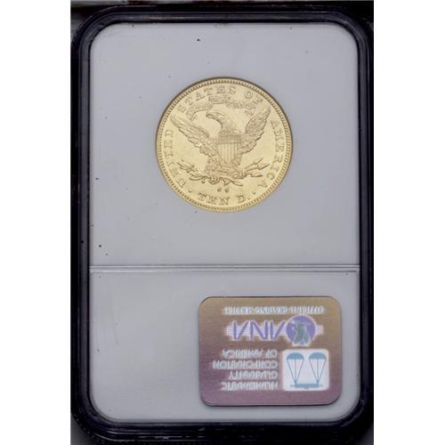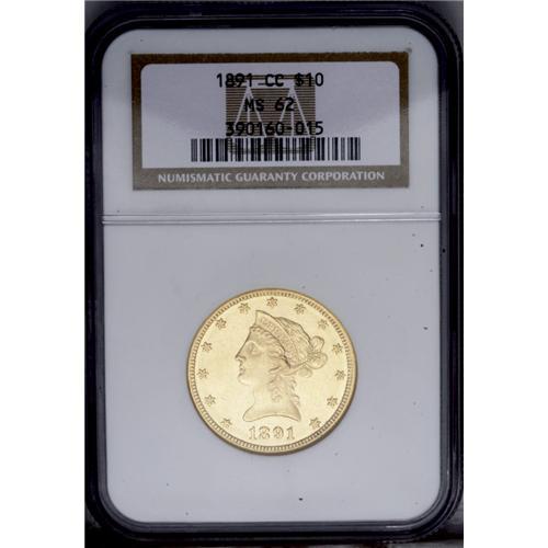 <B>1891-CC<$10> MS62 NGC.</B></I> Breen-7035. The mintmark is clearly repunched. This well struck Carson City type coin possesses ample bright luster and there are no singularly objectionable abrasions. <BR><BR><B>Important notice:</B> Heritage usually auctions material at the rate of 200-250 lots per hour. On some occasions eBay Live bid software or the Internet may not be able to keep up with the pace of the auction. We recommend placing a realistic absentee bid now as insurance to avoid disappointment. Occasionally the auctioneer may eliminate or reject an eBay Live bid, and the auctioneer may also reopen a lot after the close of the eBay live bidding (usually because we missed an audience bid), and may reject your bid even if it shows you as the winning bidder. By bidding via eBay Live, you agree that Heritage may award the lot to another bidder at its sole discretion under the circumstances described above or any other reasonable circumstances. Since eBay bids are not shown to us until we open the lot on the floor, we treat those bids just like floor bids. In most cases the floor responds before the eBay bid is presented to us, due to Internet lag time, so for consistency we have made it a policy that floor bids are always considered first over tie eBay live bids. Also please note that all Heritage lots purchased through eBay Live carry a 20% Buyer's Premium. Please make sure you read the Terms and Conditions before you bid. This lot is being auctioned in conjunction with a live floor auction by Heritage Galleries & Auctioneers. All final auction and invoice information will be supplied by Heritage Galleries & Auctioneers, and all other information should be considered preliminary. Lot:4024 <BR><BR><B>Winning Notification and Billing:</B> After the FINAL session in this auction is complete, Heritage will send e-mail and snail mail invoices. This process normally takes several days. All final auction and invoice information will be supplied by Heritage Galleries & Auctioneers, and all other information should be considered preliminary. <BR><BR>This auction will be conducted on a live auction floor and over the Internet through eBay Live. If you choose to place an absentee bid, please take a moment to <font color='#0000ff'><u><a href='http://pages.ebay.com/liveauctions/help/before/laabsentee.html'>learn how eBay Live absentee bidding works</a></u></font><font color='#000000'>