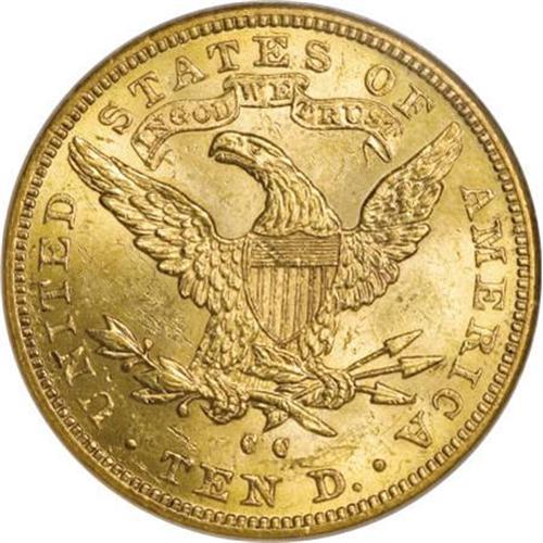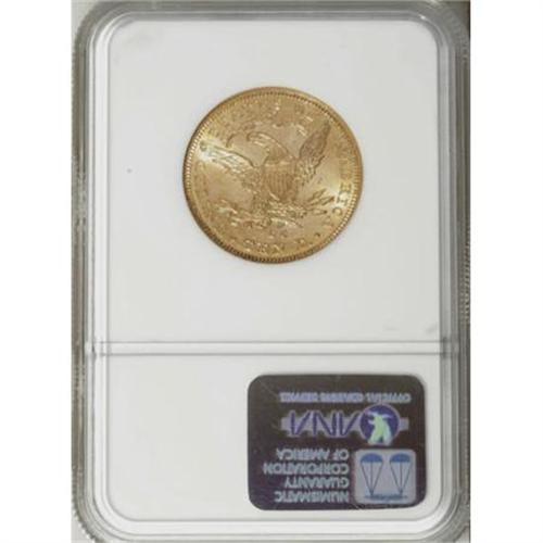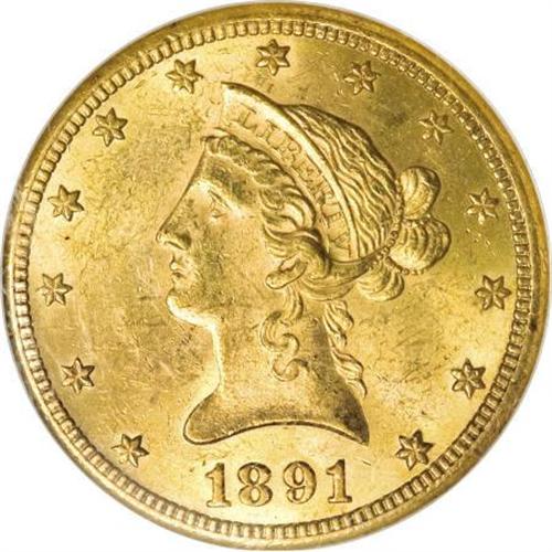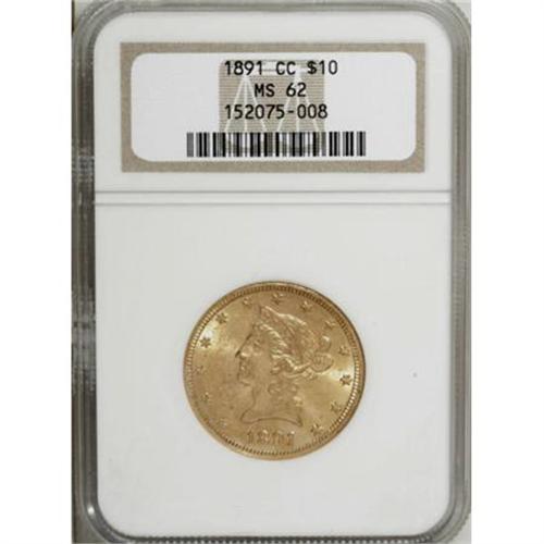 <B>1891-CC $10 MS62 NGC.</B></I> Foreign demand for gold coins threatened to overwhelm the available supply in 1891. Accordingly, San Francisco was tasked to provide a large double eagle mintage, while Carson City took on the job of producing large numbers of eagles (103,732 pieces) and half eagles (208,000 coins). Meanwhile, Philadelphia was manufacturing millions of minor coins. According to Rusty Goe's <I>The Mint on Carson Street, </B></I>"As a result of unprecedented mintages of gold eagles at the Carson Mint in 1891, more examples of this date are extant than all of the other 18 years of 'CC' gold eagles combined. Estimated survival rates range from 3% to 4% with nearly half in Uncirculated condition. Like the 1884-CC silver dollar, the 1891-CC gold eagle is Carson City's gift to the collecting community."<BR> This lustrous piece boasts splendid orange-gold coloration with a bit of smoky haze in the fields, and a few light contact marks consistent with the grade. <BR><BR><B>Coin Engraver:</B> Christian Gobrecht<BR><BR><b>Shipping:</b> Coins & Currency (<a target="_blank" href="http://www.heritageauctions.com/common/shipping.php">view shipping information</a>\)