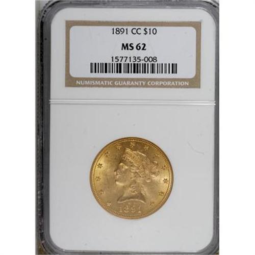 <B>1891-CC $10 MS62 NGC.</B></I> Vibrant luster and an exacting strike ensure the eye appeal of this moderately abraded piece. The 1891-CC is the only readily available CC-mint ten in Mint State.<BR><BR><B>Coin Engraver:</B> Christian Gobrecht<BR><BR><b>Shipping:</b> Coins & Currency (<a target="_blank" href="http://www.heritageauctions.com/common/shipping.php">view shipping information</a>)