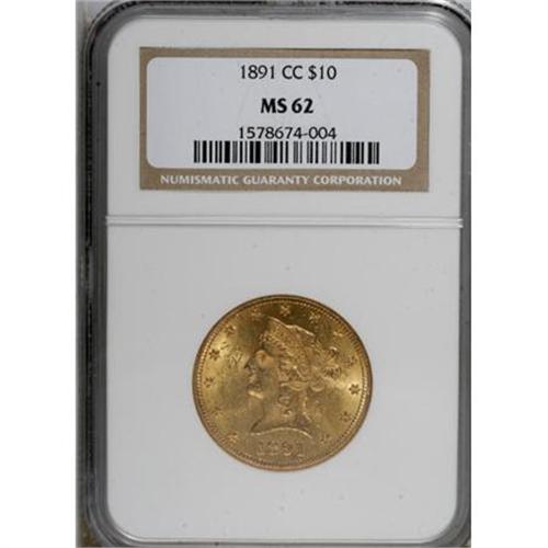 <B>1891-CC $10 MS62 NGC.</B></I> FS-501. Breen-7035. This highly lustrous Carson City Liberty ten has its share of small marks, but the strike is precise throughout. A small gray spot is noted on the shield.<BR><BR><B>Coin Engraver:</B> Christian Gobrecht<BR><BR><b>Shipping:</b> Coins & Currency (<a target="_blank" href="http://www.heritageauctions.com/common/shipping.php">view shipping information</a>)