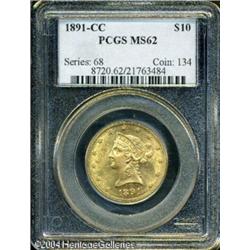 1891-CC $10 MS62 PCGS. Breen-7035, Double Punched <B>1891-CC $10 MS62 PCGS.</B></I> Breen-7035, Double Punched CC. Traces of the a second CC are seen to the right of the bold CC. This Carson City type coin has full cartwheel luster and a sharp strike. There are no obtrusive marks. <BR><BR><B>Important notice:</B> Heritage usually auctions material at the rate of 200-250 lots per hour. On some occasions eBay Live bid software or the Internet may not be able to keep up with the pace of the auction. We recommend placing a realistic absentee bid now as insurance to avoid disappointment. Occasionally the auctioneer may eliminate or reject an eBay Live bid, and the auctioneer may also reopen a lot after the close of the eBay live bidding (usually because we missed an audience bid), and may reject your bid even if it shows you as the winning bidder. By bidding via eBay Live, you agree that Heritage may award the lot to another bidder at its sole discretion under the circumstances described above or any other reasonable circumstances. Since eBay bids are not shown to us until we open the lot on the floor, we treat those bids just like floor bids. In most cases the floor responds before the eBay bid is presented to us, due to Internet lag time, so for consistency we have made it a policy that floor bids are always considered first over tie eBay live bids. Also please note that all Heritage lots purchased through eBay Live carry a 20% Buyer's Premium. Please make sure you read the Terms and Conditions before you bid. This lot is being auctioned in conjunction with a live floor auction by Heritage Galleries & Auctioneers. All final auction and invoice information will be supplied by Heritage Galleries & Auctioneers, and all other information should be considered preliminary. Lot:6766