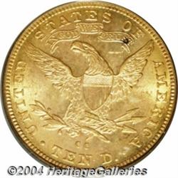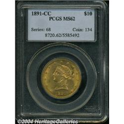 <B>1891-CC<$10> MS62 PCGS.</B></I> This Carson City issue has impressive luster beneath rich apricot-gold patination. The design elements are well struck, further enhancing the eye appeal of this pleasing specimen. A few light abrasions are seen, the most notable being located to the right of Liberty's nose, and another just above the lip. <BR><BR><B>Important notice:</B> Heritage usually auctions material at the rate of 200-250 lots per hour. On some occasions eBay Live bid software or the Internet may not be able to keep up with the pace of the auction. We recommend placing a realistic absentee bid now as insurance to avoid disappointment. Occasionally the auctioneer may eliminate or reject an eBay Live bid, and the auctioneer may also reopen a lot after the close of the eBay live bidding (usually because we missed an audience bid), and may reject your bid even if it shows you as the winning bidder. By bidding via eBay Live, you agree that Heritage may award the lot to another bidder at its sole discretion under the circumstances described above or any other reasonable circumstances. Since eBay bids are not shown to us until we open the lot on the floor, we treat those bids just like floor bids. In most cases the floor responds before the eBay bid is presented to us, due to Internet lag time, so for consistency we have made it a policy that floor bids are always considered first over tie eBay live bids. Also please note that all Heritage lots purchased through eBay Live carry a 20% Buyer's Premium. Please make sure you read the Terms and Conditions before you bid. </span></font></tr></table></td></tr></table>