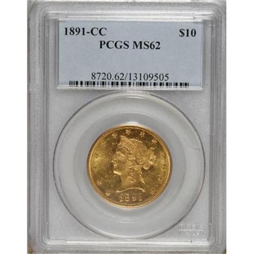 <B>1891-CC $10 MS62 PCGS.</B></I> Breen-7035, FS-501. The Carson City mintmark is clearly repunched west. A well struck and mildly prooflike example with the expected number of small marks.<BR><BR><b>Shipping:</b> Coins & Currency (<a target="_blank" href="http://www.heritageauctions.com/common/shipping.php">view shipping information</a>)