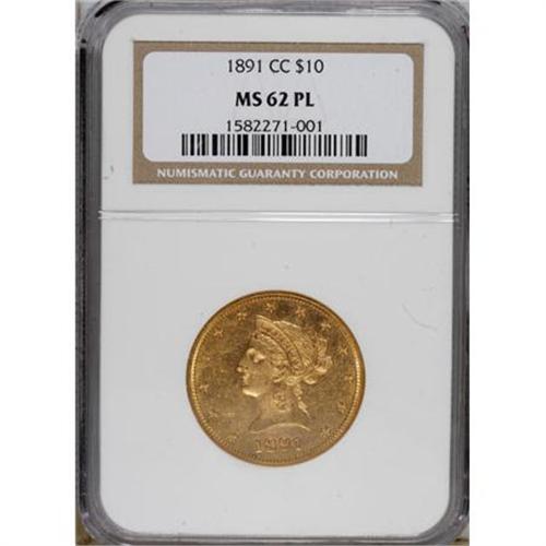 <B>1891-CC $10 MS62 Prooflike NGC.</B></I> The 1891-CC is plentiful by Carson City standards, but prooflike pieces are very scarce. This flashy and crisply impressed Liberty ten has a clean portrait and good eye appeal. Census: 9 in 62 Prooflike, 0 finer (5/07).<BR><BR><b>Shipping:</b> Coins & Currency (<a target="_blank" href="http://www.heritageauctions.com/common/shipping.php">view shipping information</a>)