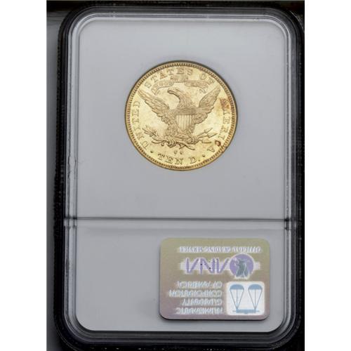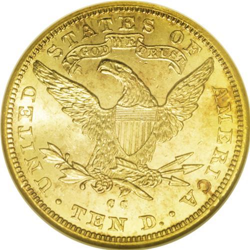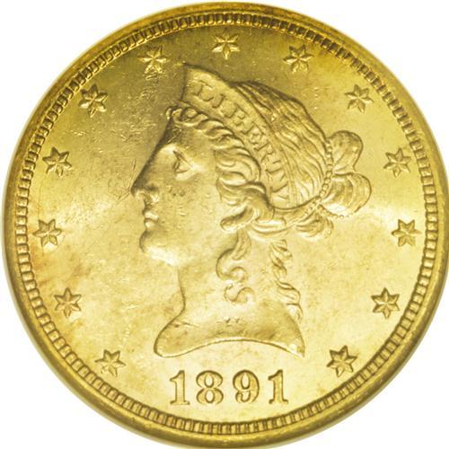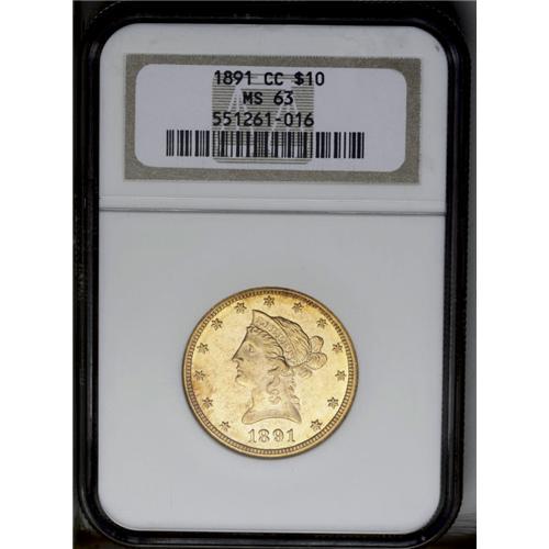 <B>1891-CC<$10> MS63 NGC.</B></I> Breen-7035. The mintmark is broadly repunched. Bright and exceedingly frosty, with rich red-gold coloration and a few red-orange alloy splotches near the borders on each side. Well struck and highly lustrous, with a typical number of small abrasions for the grade.<BR><I>From The Clifton Rodenburg Collection.</B></I>