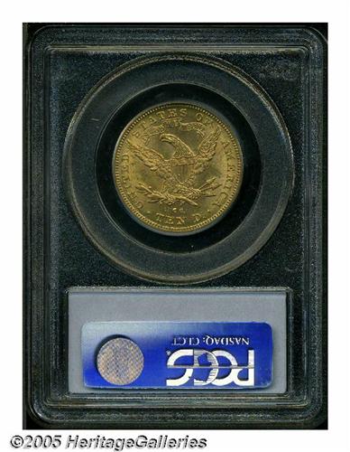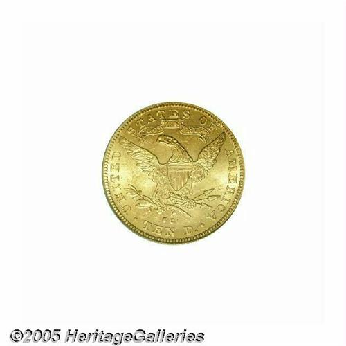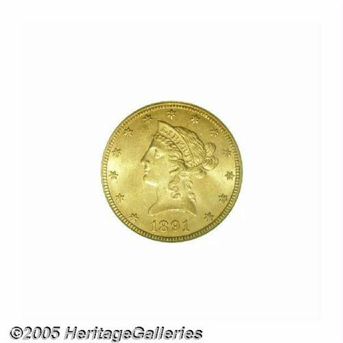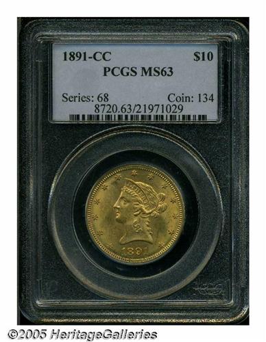 <B>1891-CC<$10> MS63 PCGS.</B></I> The 1891-CC is a popular Carson City type coin whose mintage of 103,732 pieces represents a substantial percentage of all the tens produced in this widely collected Western mint. This MS63 coin is near the pinnacle of preservation of this issue. While some hundred pieces have been certified in MS63, a paltry 10 coins have been graded in higher grades (5/05). The orange-gold coloration of this coin is spread evenly over the rich, lustrous surfaces. Fully struck throughout, there are no abrasions worthy of individual mention, just numerous small ones that one would expect for an MS63.