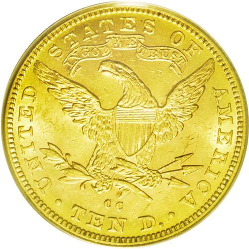 <B>1891-CC<$10> MS63 PCGS.</B></I> The majority of Carson City eagle issues are rare in any grade, and only the 1891-CC is readily obtained above basal Mint State. CC-mint type collectors are thus compelled to select an 1891-CC, particularly if full mint luster and relatively clean surfaces are required. This attractive piece has a clean obverse and only a couple of minor pinscratches on the reverse, near the branch stem and upper arrowhead. Population: 33 in 63, 2 finer (5/06).