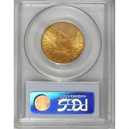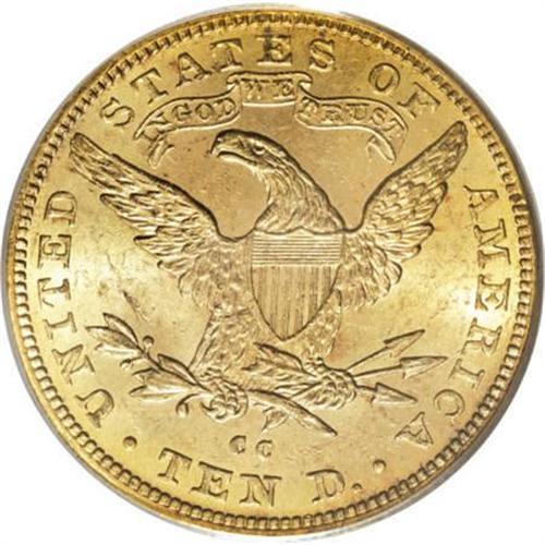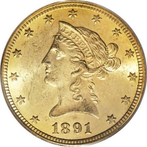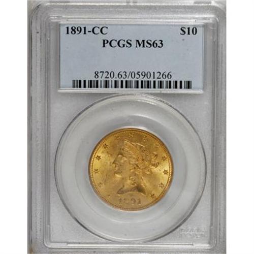 <B>1891-CC $10 MS63 PCGS.</B></I> This sharply impressed Carson City type coin has unencumbered cartwheel sheen, and the medium peach and lime-green toning is both original and attractive. Careful examination locates occasional minor field marks, but these are customary for the Select grade. Very rare any finer. Population: 44 in 63, 3 finer (10/07).<BR><BR><B>Coin Engraver:</B> Christian Gobrecht<BR><BR><b>Shipping:</b> Coins & Currency (<a target="_blank" href="http://www.heritageauctions.com/common/shipping.php">view shipping information</a>)