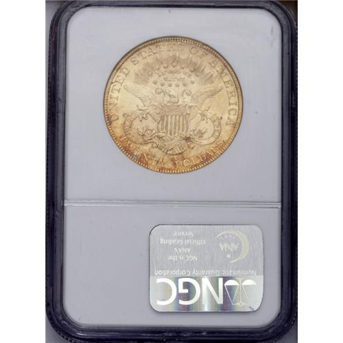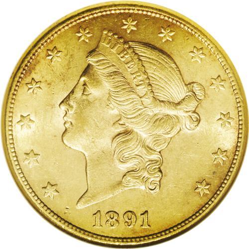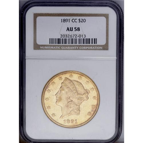 <B>1891-CC $20 AU58 NGC.</B></I> While half eagles and eagles of this issue are among the most plentiful in their respective denominations, the 1891-CC double eagle is an important rarity, and has the second lowest mintage of any double eagle from this mint. Just 5,000 were coined, and today, only about 150 to 200 survive in all grades. Winter estimated that only 10 to 15 examples are known in strict Mint State quality. Just a trace of wear on the very highest design points keep this from the Mint State grades. The fields are very slightly reflective and each side has nearly complete luster. Hints of rose toning add to the overall aesthetic appeal. A few minute bag marks and luster grazes are noted on the obverse, but do not distract.