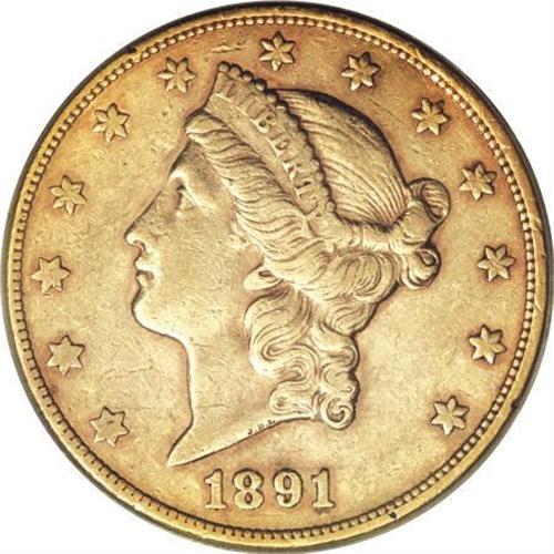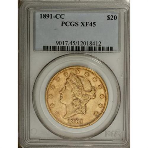 <B>1891-CC $20 XF45 PCGS.</B></I> The 1891-CC double eagle is among the lowest-mintage emissions from the Carson City Mint, but due to its position as also among the last issues from that mint, the survivorship is much higher than for earlier low-mintage dates such as, for example, the 1870-CC. Many later double eagle dates, both Liberty Head and Saint-Gaudens, were exported when European banks began fearing that the United States might buck the world trend and adopt a silver standard. This prompted increased demands for international transactions to be completed with gold coinage, fortunately for later American gold collectors. The 1870-CC, of course, also circulated to a much greater extent than the later issue.<BR> This yellow-orange Choice XF piece has the expected number of marks for the grade, but there are no individually disturbing abrasions. A couple of tiny rim nicks are noted at 2:30 and 3:30. Light strike weakness is noted at the lower left quadrant of each side.<BR><I>From The York/Hallenbeck #2 Current Finest PCGS Registry Set of Liberty Double Eagles.</B></I><BR><BR><B>Coin Engraver:</B> James B. Longacre<BR><BR><b>Shipping:</b> Coins & Currency (<a target="_blank" href="http://www.heritageauctions.com/common/shipping.php">view shipping information</a>)