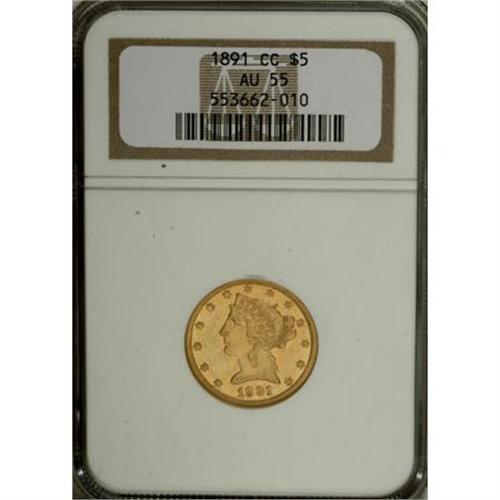<B>1891-CC $5 AU55 NGC.</B></I> NGC Census: (116/1125). PCGS Population (159/739). Mintage: 208,000. Numismedia Wsl. Price for NGC/PCGS coin in AU55: $610. (#8378)<BR><BR><B>Coin Engraver:</B> Christian Gobrecht<BR><BR><b>Shipping:</b> Coins & Currency (<a target="_blank" href="http://www.heritageauctions.com/common/shipping.php">view shipping information</a>)