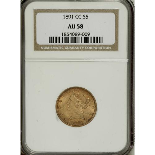 1891-CC $5 AU58 NGC. NGC Census: (294/750). PCGS P
