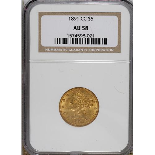 1891-CC $5 AU58 NGC. NGC Census: (590/1500). PCGS
