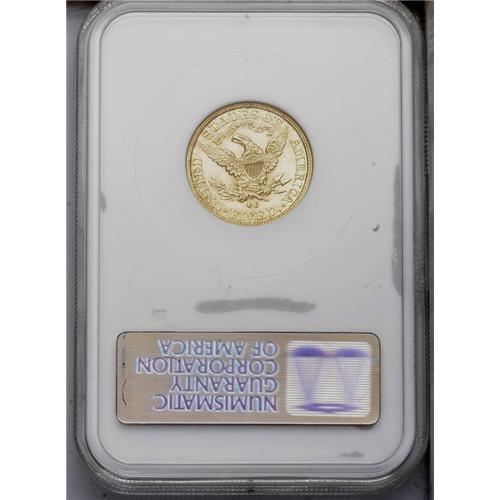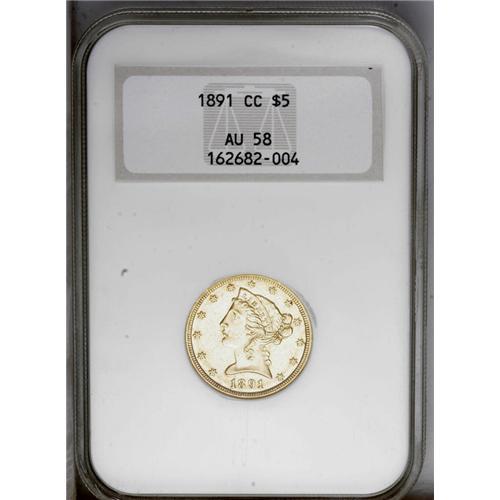 <B>1891-CC<$5> AU58 NGC.</B></I> Well struck and highly lustrous, with a not-excessive number of wispy surface blemishes and some slight reddish color on the lower reverse. In the absence of noticeable highpoint wear, this example seems conservatively graded at AU58. <BR><BR><B>Important notice:</B> Heritage usually auctions material at the rate of 200-250 lots per hour. On some occasions eBay Live bid software or the Internet may not be able to keep up with the pace of the auction. We recommend placing a realistic absentee bid now as insurance to avoid disappointment. Occasionally the auctioneer may eliminate or reject an eBay Live bid, and the auctioneer may also reopen a lot after the close of the eBay live bidding (usually because we missed an audience bid), and may reject your bid even if it shows you as the winning bidder. By bidding via eBay Live, you agree that Heritage may award the lot to another bidder at its sole discretion under the circumstances described above or any other reasonable circumstances. Since eBay bids are not shown to us until we open the lot on the floor, we treat those bids just like floor bids. In most cases the floor responds before the eBay bid is presented to us, due to Internet lag time, so for consistency we have made it a policy that floor bids are always considered first over tie eBay live bids. Also please note that all Heritage lots purchased through eBay Live carry a 20% Buyer's Premium. Please make sure you read the Terms and Conditions before you bid. This lot is being auctioned in conjunction with a live floor auction by Heritage Galleries & Auctioneers. All final auction and invoice information will be supplied by Heritage Galleries & Auctioneers, and all other information should be considered preliminary. Lot:2821 <BR><BR><B>Winning Notification and Billing:</B> After the FINAL session in this auction is complete, Heritage will send e-mail and snail mail invoices. This process normally takes several days. All final auction and invoice information will be supplied by Heritage Galleries & Auctioneers, and all other information should be considered preliminary. <BR><BR>This auction will be conducted on a live auction floor and over the Internet through eBay Live. If you choose to place an absentee bid, please take a moment to <font color='#0000ff'><u><a href='http://pages.ebay.com/liveauctions/help/before/laabsentee.html'>learn how eBay Live absentee bidding works</a></u></font><font color='#000000'>