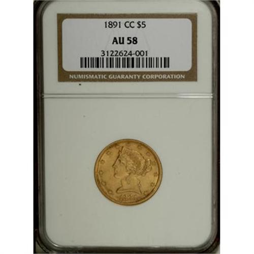 <B>1891-CC $5 AU58 NGC.</B></I> Just a touch of highpoint friction visits the well-defined devices, and the luster of the sun-gold fields is essentially intact. An attractive, minimally marked example of this popular Carson City issue.<BR><BR><B>Coin Engraver:</B> Christian Gobrecht<BR><BR><b>Shipping:</b> Coins & Currency (<a target="_blank" href="http://www.heritageauctions.com/common/shipping.php">view shipping information</a>)