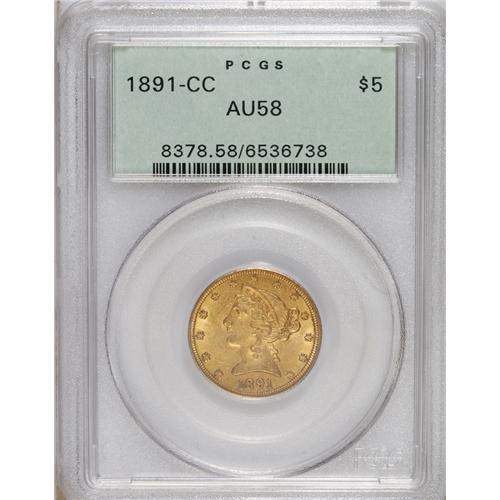1891-CC $5 AU58 PCGS. Boldly struck and lacking obviou