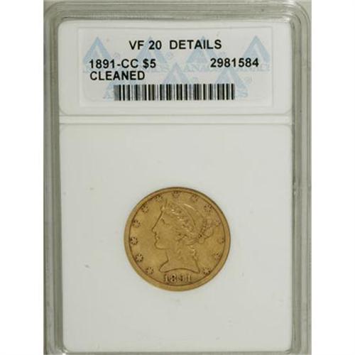 <B>1891-CC $5 --Cleaned--ANACS. VF20 Details.</B></I> NGC Census: (2/1314). PCGS Population (1/1048). Mintage: 208,000. Numismedia Wsl. Price for NGC/PCGS coin in VF20: $275. (#8378)<BR><BR><b>Shipping:</b> Coins & Currency (<a target="_blank" href="http://www.heritageauctions.com/common/shipping.php">view shipping information</a>)