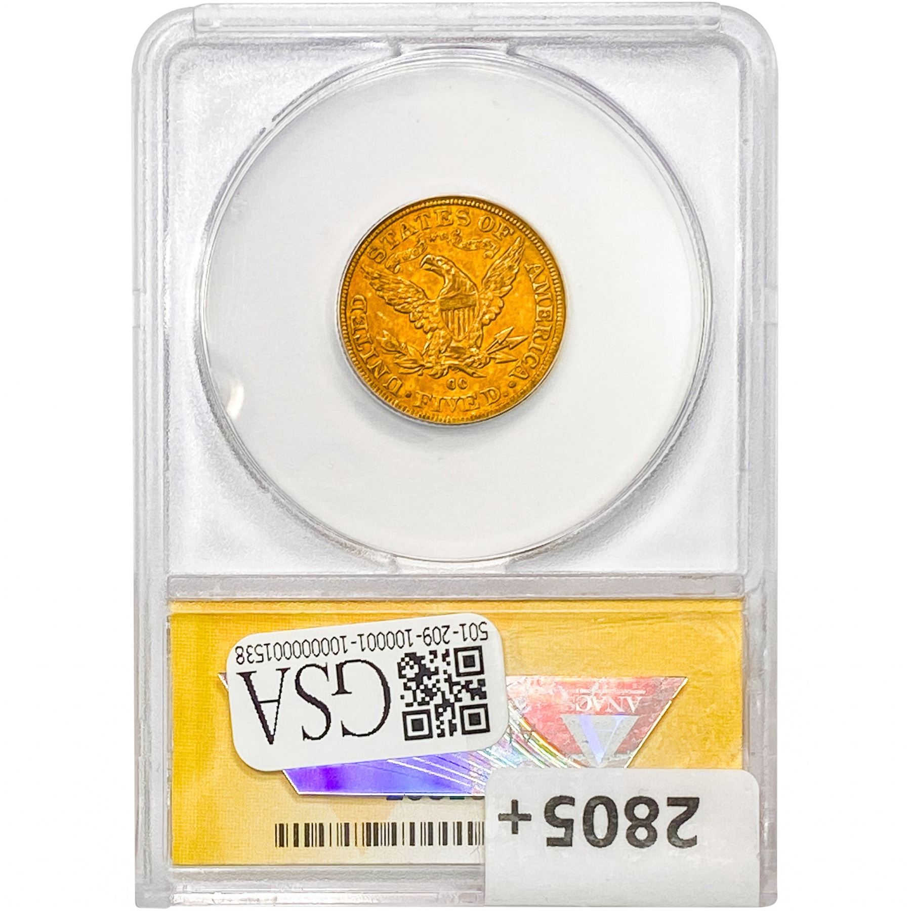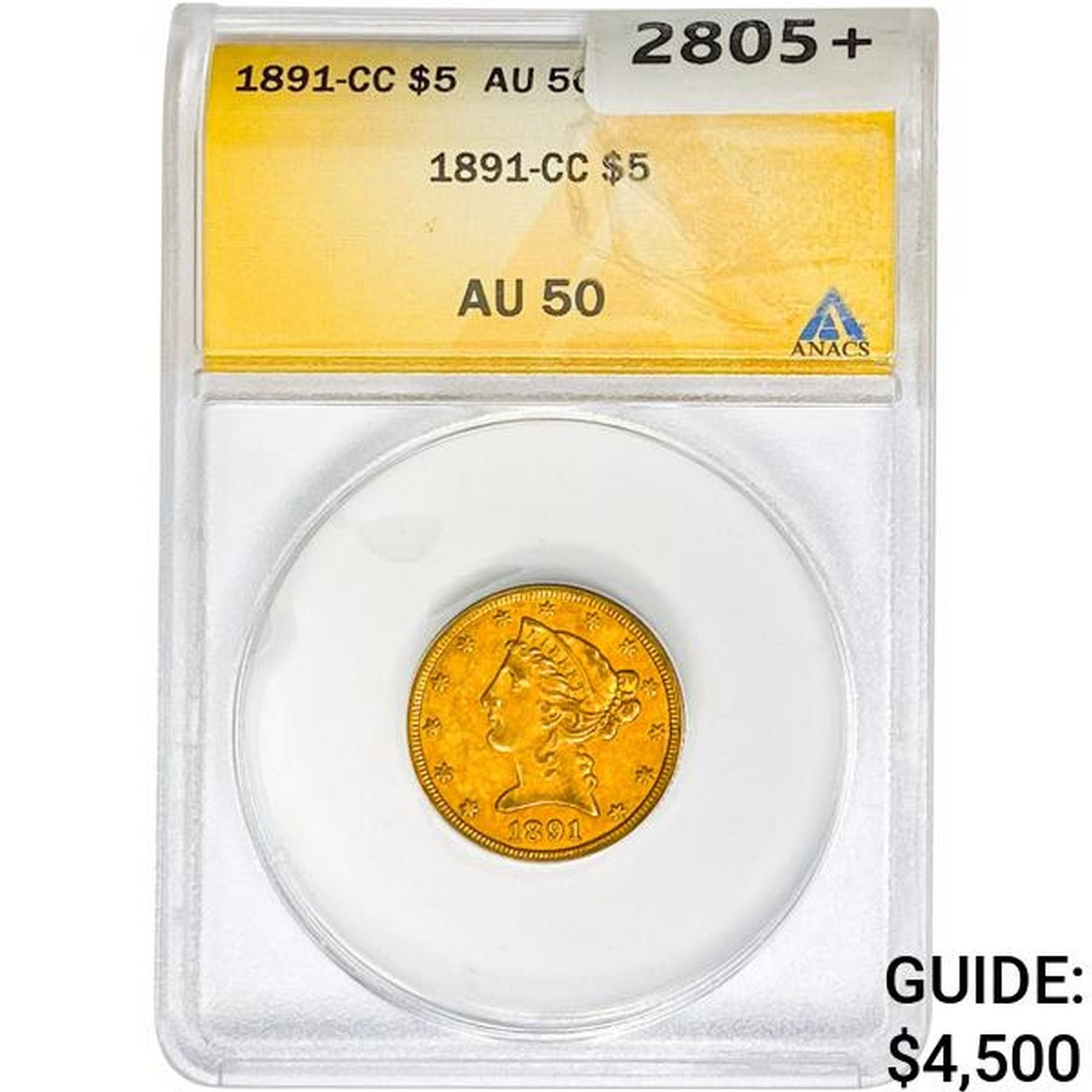 1891-CC $5 Gold Half Eagle ANACS AU50