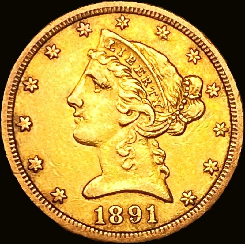 1891-CC $5 Gold Half Eagle CLOSELY UNCIRCULATED