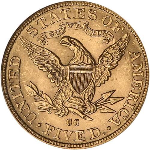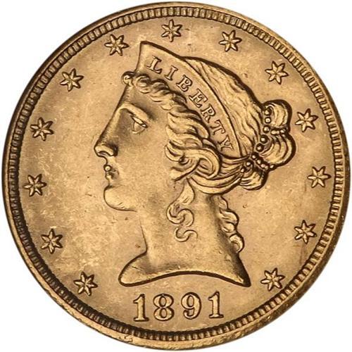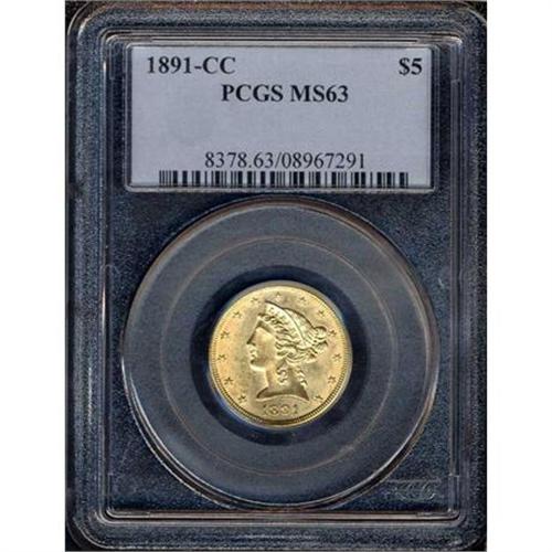 <b>1891-CC $5 Liberty. PCGS graded MS63.</b> A satiny gold example with typical light bagmarks for the grade. The fresh looking cartwheel luster graces both sides of the piece with its faint reddish gold hue. Sharply struck for the date, easily finer in sharpness than many gold half eagles struck at this Western mint <b>(PCGS # 8378)</b> <i>