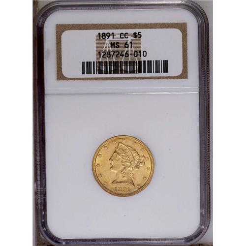 1891-CC $5 MS61 NGC. Bright and frosty, with deep colo 1891-CC[$5] MS61 NGC.