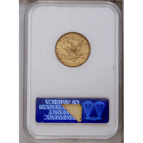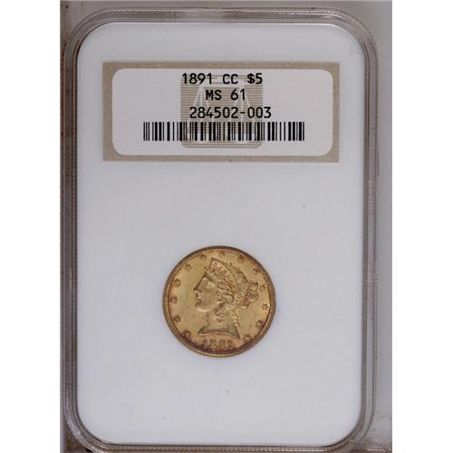 <B>1891-CC $5 MS61 NGC.</B></I> This CC issue displays lustrous apricot-gold surfaces with reddish-orange peripheral accents, and light to moderate contact marks, especially on the obverse. The design elements are sharply struck throughout.