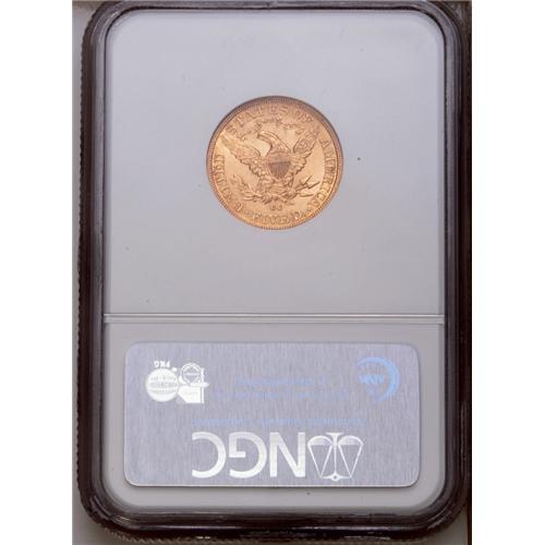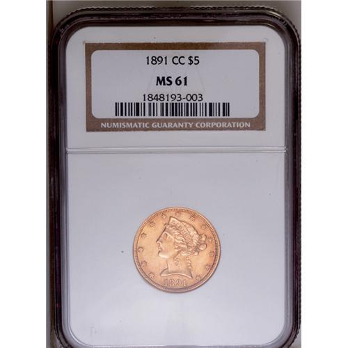 <B>1891-CC<$5> MS61 NGC.</B></I> This issue is one of the best opportunities to own Carson City gold, and the present piece has lustrous orange-gold surfaces and a sharp strike. Small abrasions in the field limit the grade, but not the eye appeal.