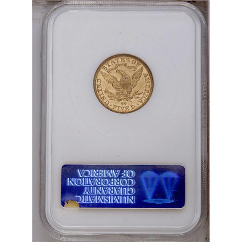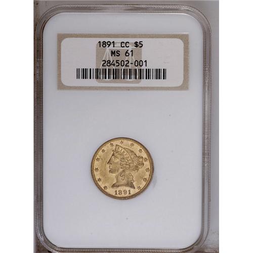<B>1891-CC $5 MS61 NGC.</B></I> Yellow-gold surfaces display partially prooflike fields that establish a moderate contrast with the sharply defined motifs when the coin is tilted beneath a light source. Several minuscule marks evenly distribute over both sides cause a slight disruption in the luster flow.
