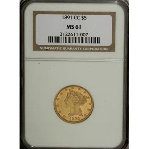 <B>1891-CC $5 MS61 NGC.</B></I> Well struck with lustrous surfaces that reveal minimal evidence of mishandling or neglect on either side. The eagle's shield has a layer of lilac-rose toning across the horizontal stripes. Specks of dark-green verdigris are noted near the second S in STATES, and two or three tiny alloy spots occur near the peripheries. An ideal candidate for a Mint State Carson City type set. <BR><I>From The John Stimson, Sr. Collection, Part Two.</B></I><BR><BR><B>Coin Engraver:</B> Christian Gobrecht<BR><BR><b>Shipping:</b> Coins & Currency (<a target="_blank" href="http://www.heritageauctions.com/common/shipping.php">view shipping information</a>)