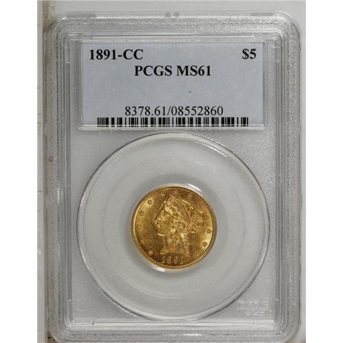 1891-CC $5 MS61 PCGS. Nicely struck with a hint of ora