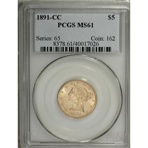 <B>1891-CC $5 MS61 PCGS.</B></I> Dazzling luster, rich honey-gold toning, and a pleasing strike confirm the quality of this moderately abraded Mint State Carson City type coin.<BR><BR><B>Coin Engraver:</B> Christian Gobrecht<BR><BR><b>Shipping:</b> Coins & Currency (<a target="_blank" href="http://www.heritageauctions.com/common/shipping.php">view shipping information</a>)