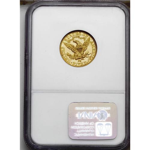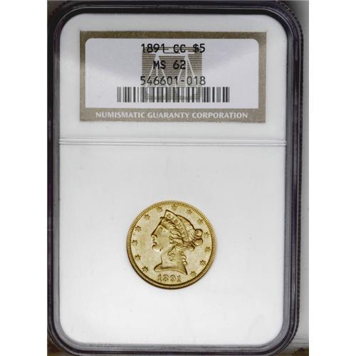 <B>1891-CC<$5> MS62 NGC.</B></I> This crisply impressed Carson City gold type coin displays good luster and has only one noticeable mark, located on Liberty's jaw. Although the 1891-CC half eagle and eagle are available, the 1891-CC double eagle is a significant rarity.