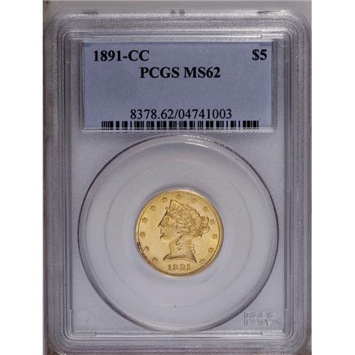 <B>1891-CC $5 MS62 PCGS.</B></I> A well struck example of this popular Carson City half eagle. Bright and lustrous, a few minor marks are peppered mostly across the obverse.