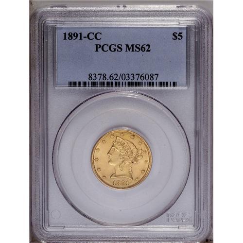 "1891-CC $5 MS62 PCGS. Well struck, save"