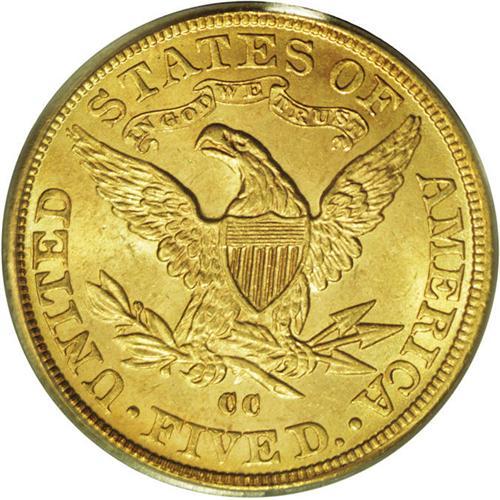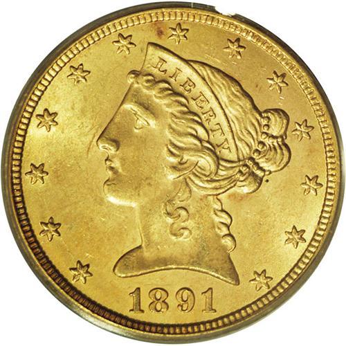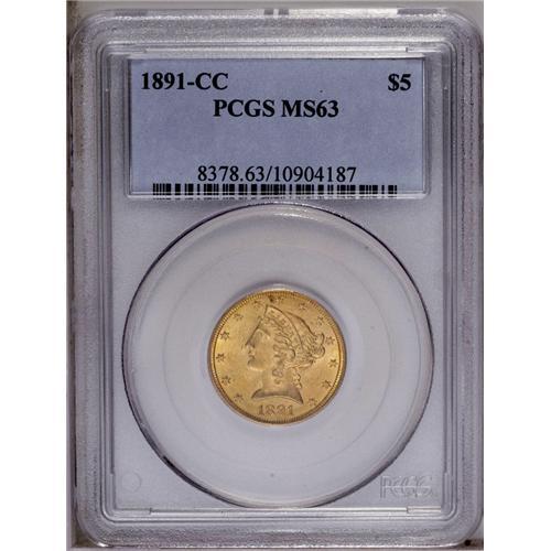 <B>1891-CC<$5> MS63 PCGS.</B></I> Generally considered a common CC issue, the 1891-CC is actually quite scarce in strict, Select Uncirculated condition. This piece is fully struck and typically abraded with rich reddish patina over each side. Population: 67 in 63, 33 finer (3/06). <BR><BR><B>Important notice:</B> Heritage usually auctions material at the rate of 200-250 lots per hour. On some occasions eBay Live bid software or the Internet may not be able to keep up with the pace of the auction. We recommend placing a realistic absentee bid now as insurance to avoid disappointment. Occasionally the auctioneer may eliminate or reject an eBay Live bid, and the auctioneer may also reopen a lot after the close of the eBay live bidding (usually because we missed an audience bid), and may reject your bid even if it shows you as the winning bidder. By bidding via eBay Live, you agree that Heritage may award the lot to another bidder at its sole discretion under the circumstances described above or any other reasonable circumstances. Since eBay bids are not shown to us until we open the lot on the floor, we treat those bids just like floor bids. In most cases the floor responds before the eBay bid is presented to us, due to Internet lag time, so for consistency we have made it a policy that floor bids are always considered first over tie eBay live bids. Also please note that all Heritage lots purchased through eBay Live carry a 20% Buyer's Premium. Please make sure you read the Terms and Conditions before you bid. This lot is being auctioned in conjunction with a live floor auction by Heritage Galleries & Auctioneers. All final auction and invoice information will be supplied by Heritage Galleries & Auctioneers, and all other information should be considered preliminary. Lot:2825 <BR><BR><B>Winning Notification and Billing:</B> After the FINAL session in this auction is complete, Heritage will send e-mail and snail mail invoices. This process normally takes several days. All final auction and invoice information will be supplied by Heritage Galleries & Auctioneers, and all other information should be considered preliminary. <BR><BR>This auction will be conducted on a live auction floor and over the Internet through eBay Live. If you choose to place an absentee bid, please take a moment to <font color='#0000ff'><u><a href='http://pages.ebay.com/liveauctions/help/before/laabsentee.html'>learn how eBay Live absentee bidding works</a></u></font><font color='#000000'>