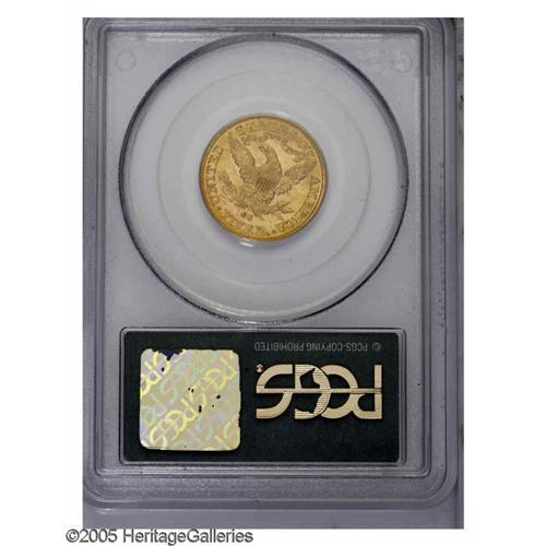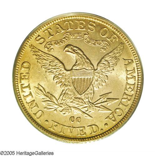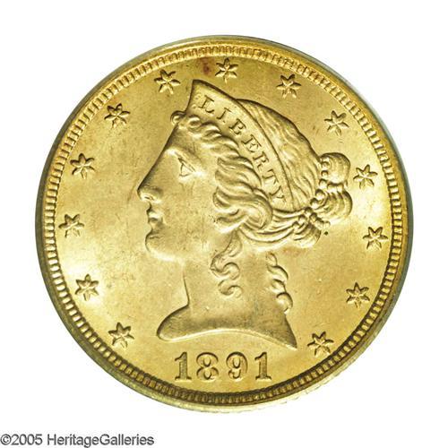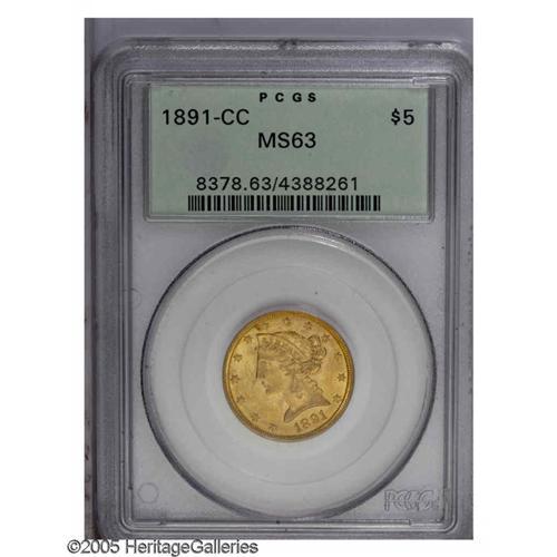 <B>1891-CC<$5> MS63 PCGS.</B></I> Honey-gold obverse with a splash of teal at Liberty's neck, with a slightly darker copper-gold reverse. A few scattered marks are consistent with the grade, and examination with a glass reveals a small dark spot just in back of Liberty's hair cord. An overall appealing example of this issue, one of the more common from the ever-popular Carson City mint. PCGS has graded 66 at this level, with 29 finer (10/05).
