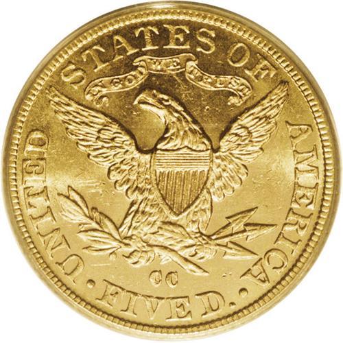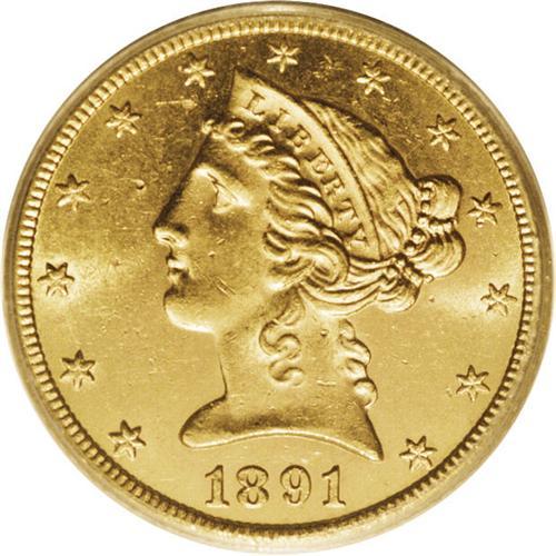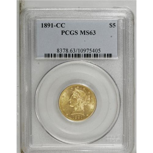 <B>1891-CC $5 MS63 PCGS.</B></I> This precisely struck Carson City gold type coin has booming luster and attractive preservation. The 1891-CC is available in AU58 to MS62 grades, but populations drop off dramatically thereafter. PCGS has certified only a single piece as MS65, with none finer.<BR><BR><b>Shipping:</b> Coin/Currency (<a target="_blank" href="http://www.heritageauctions.com/common/shipping.php">view shipping information</a>)