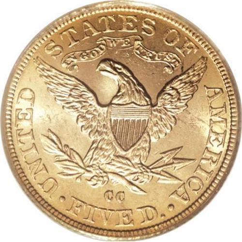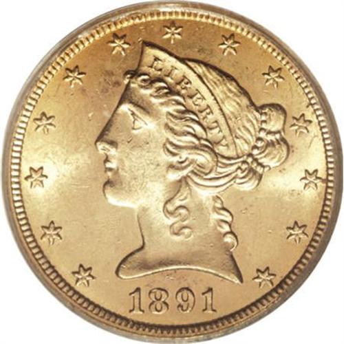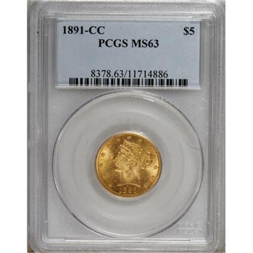 <B>1891-CC $5 MS63 PCGS.</B></I> A lovely orange-gold Carson City gold type coin that boasts vivid luster and only moderate field grazes. Well struck and attractive. The 1891-CC is more available than its mintage of 208,000 pieces suggests, but most examples grade between AU55 and MS62, and PCGS has certified only a single piece above MS64 (7/07).<BR><BR><B>Coin Engraver:</B> Christian Gobrecht<BR><BR><b>Shipping:</b> Coins & Currency (<a target="_blank" href="http://www.heritageauctions.com/common/shipping.php">view shipping information</a>)