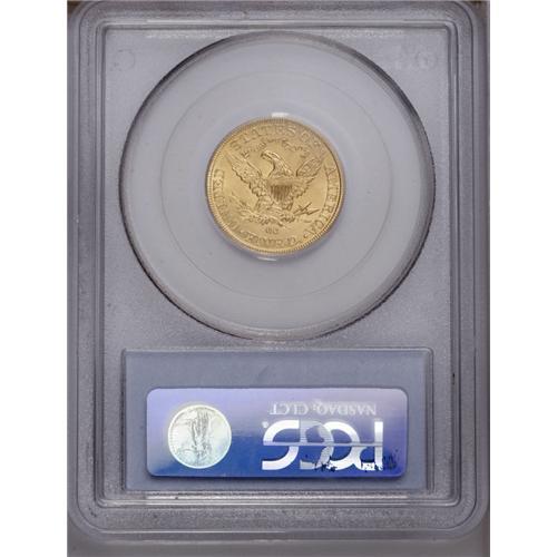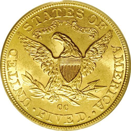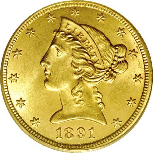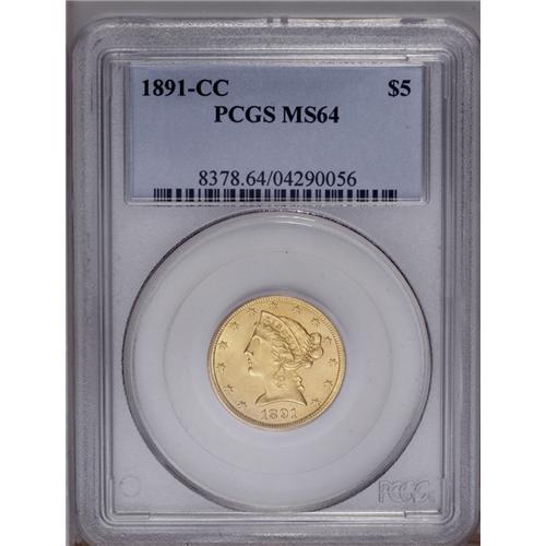 <B>1891-CC $5 MS64 PCGS.</B></I> The 1891-CC is the most common Carson City Mint half eagle. It is estimated that perhaps 1250-1500 pieces are extant today in all grades. However, in MS64 only 69 pieces have been so graded with eight finer by the combined staffs of NGC and PCGS (12/05). This is a terrific coin. The surfaces are bright yellow-gold and show minimal abrasions. Sharply defined throughout with strong definition on both Liberty's hair curls as well as the eagle's neck.