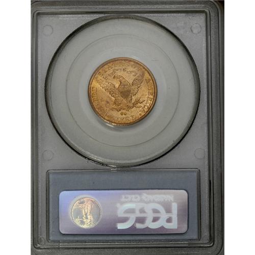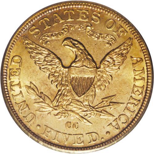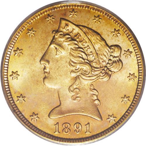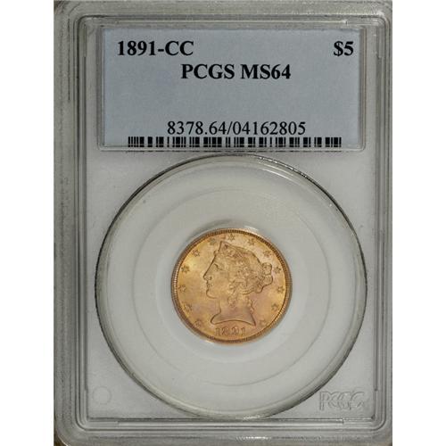 <B>1891-CC $5 MS64 PCGS.</B></I> The glowing surfaces are lustrous and boast deep, unusually attractive copper-red, green-gold, and peach toning. The design motifs are boldly struck, as numerous wispy marks limit the grade. A common date that becomes elusive at the near-Gem grade level. Population: 36 in 64, 1 finer (1/07).<BR><BR><b>Shipping:</b> Coins & Currency (<a target="_blank" href="http://www.heritageauctions.com/common/shipping.php">view shipping information</a>)