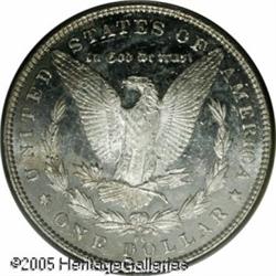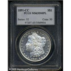 <B>1891-CC<img border='0' src='http://www.heritagecoins.com/images/star.gif' width=10 height=10>$1 MS63 Deep Mirror Prooflike PCGS.</B></I> A sparkling white coin that shows deep mirrored fields and well frosted devices. Liberty has a few nicks and marks, and one moderate scuff just below her temple. The reverse has a minor splash of light gold in the fields. A difficult issue to find with the Deep Mirror Prooflike fields. Population: 98 in 63, 42 finer (1/05). Lot:10368
