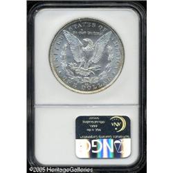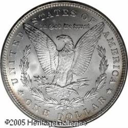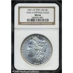 <B>1891-CC<img border='0' src='http://www.heritagecoins.com/images/star.gif' width=10 height=10>$1 MS66 NGC.</B></I> VAM-3. A Top 100 Variety. A band of golden-brown color graces the lower reverse border, but this fully struck premium Gem is otherwise brilliant. The "Spitting Eagle" variety, not really a rarity in Mint State, however, few survivors can match the stellar quality of the present lustrous and splendidly undisturbed example. Population: 13 in 66, 1 finer (1/05).<BR><I>From The Banks Collection.</B></I> Lot:10365
