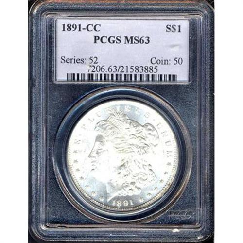 <b>1891-CC Morgan Dollar. PCGS graded MS63.</b> There is little to say about the surfaces of this coin as they are as near to pure white as imaginable. The mint frost is thick and radiates intensely over each side. There is just a bit of light bagging present as well. A solid MS63 coin <b>(PCGS # 7206)</b>