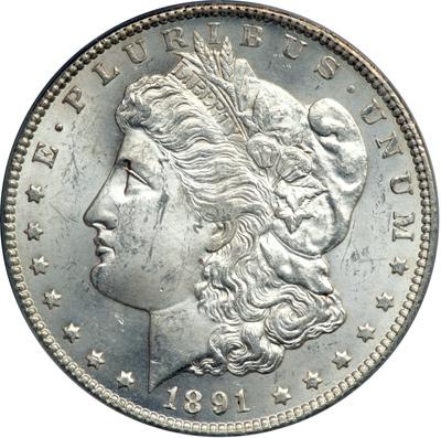1891-CC Morgan Dollar. PCGS graded MS-63. Mostly white coin, choice with mint frost (PCGS # 7206) .