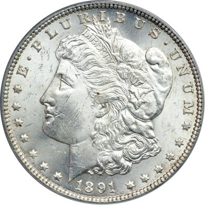 1891-CC Morgan Dollar. PCGS graded MS-63. Nice and frosty, with choice areas predominating; only a few tiny marks on the cheek (PCGS # 7206) .